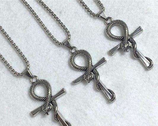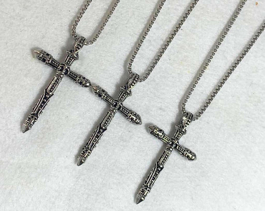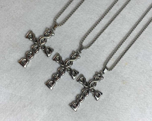 SILVER STAINLESS STEEL NECKLACE CROSS WITH SNAKE – Set of 12