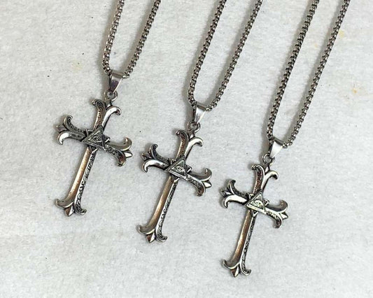 SILVER STAINLESS STEEL NECKLACE CROSS WITH THE ALL-SEEING EYE – Set of 12