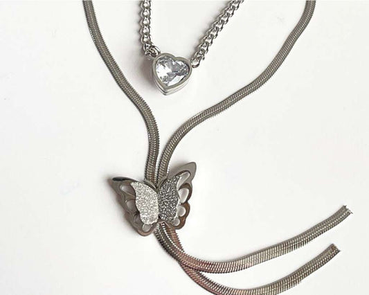 SET SILVER EARRINGS AND NECKLACE BUTTERFLY ZIRCONIA HEART- Set of 12