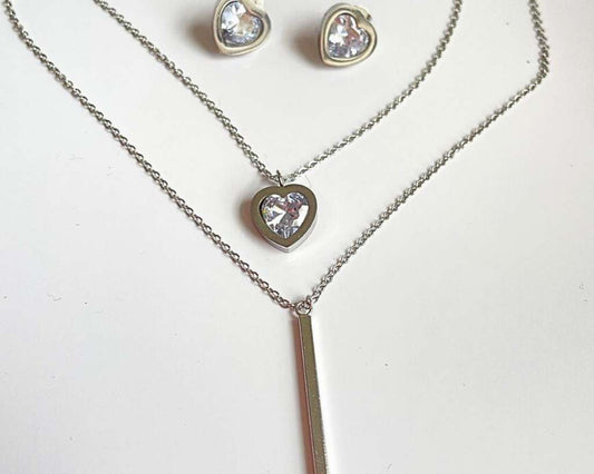 SET SILVER EARRINGS HEART AND NECKLACE STEEL BAR- Set of 12