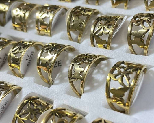 GOLDEN STAINLESS STEEL THREE BUTTERFLIES RING – Set of 36