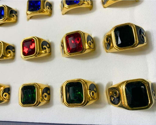 GOLDEN STAINLESS STEEL RING WITH COLORED STONE YIN YANG SYMBOL – Set of 12
