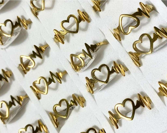 GOLDEN STAINLESS STEEL HEART AND BEAT RING – Set of 36