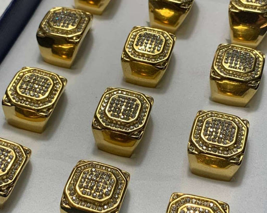 LARGE SQUARE GOLDEN STAINLESS STEEL RING WITH RHINESTONES – Set of 12