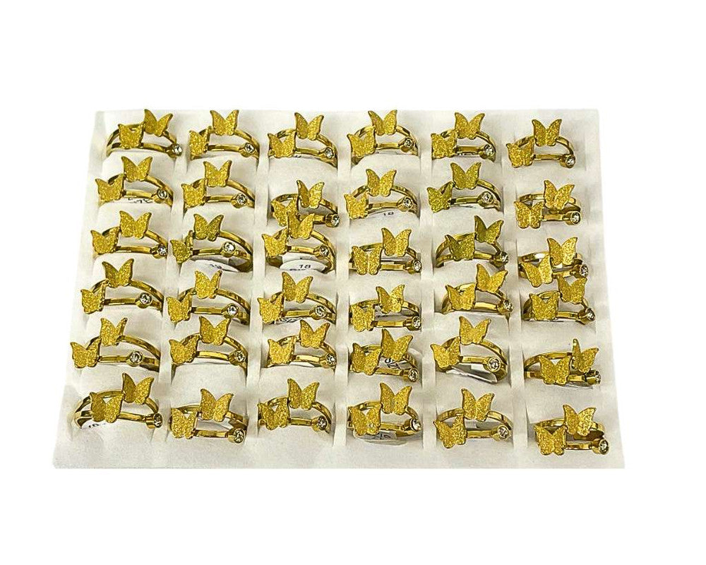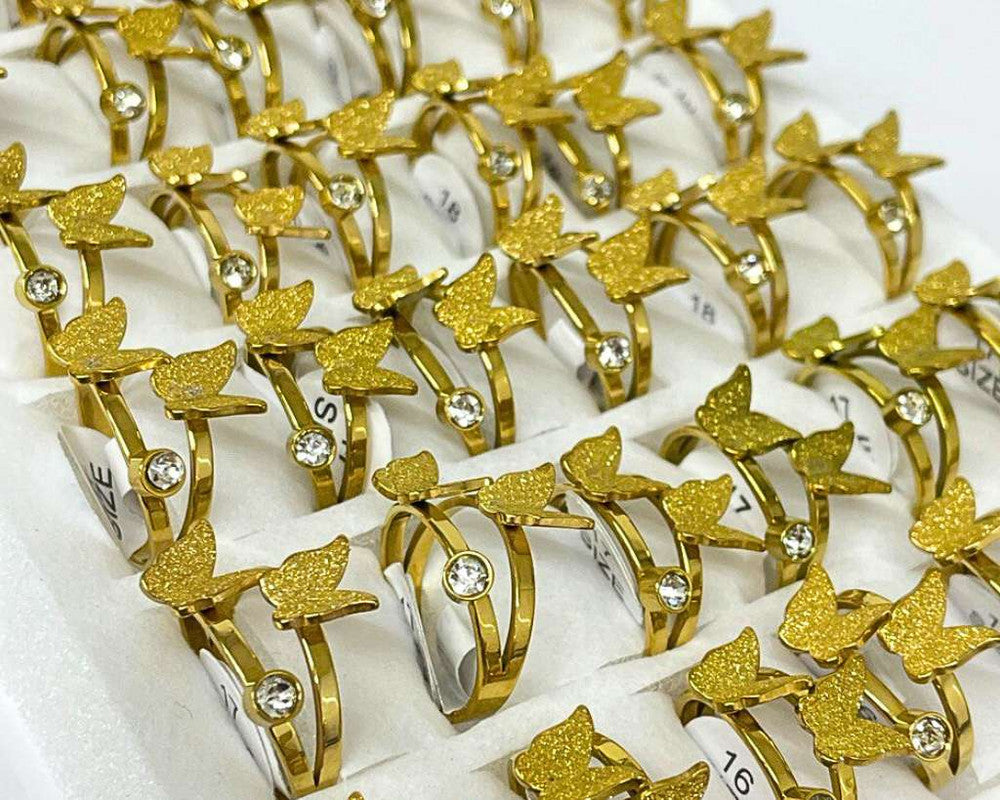 - Expertly crafted in golden stainless steel, this set of 36 rings features intricate butterfly designs adorned with sparkling diamond and zirconia details. Beautiful and durable, these rings are sure to elevate any outfit with a touch of elegance and shine. Perfect for any occasion, they make a stunning addition to any jewelry collection.